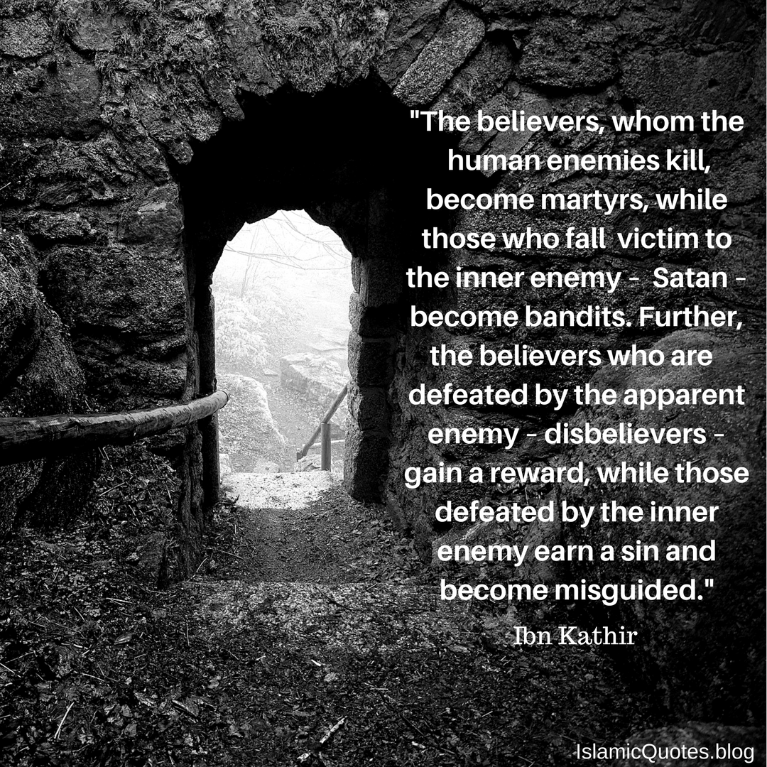 “The believers, whom the human enemies kill, become martyrs, while those who fall victim to the inner enemy – Satan – become bandits. Further, the believers who are defeated by the apparent enemy – disbelievers – gain a reward, while those defeated by the inner enemy earn a sin and become misguided.” [1]